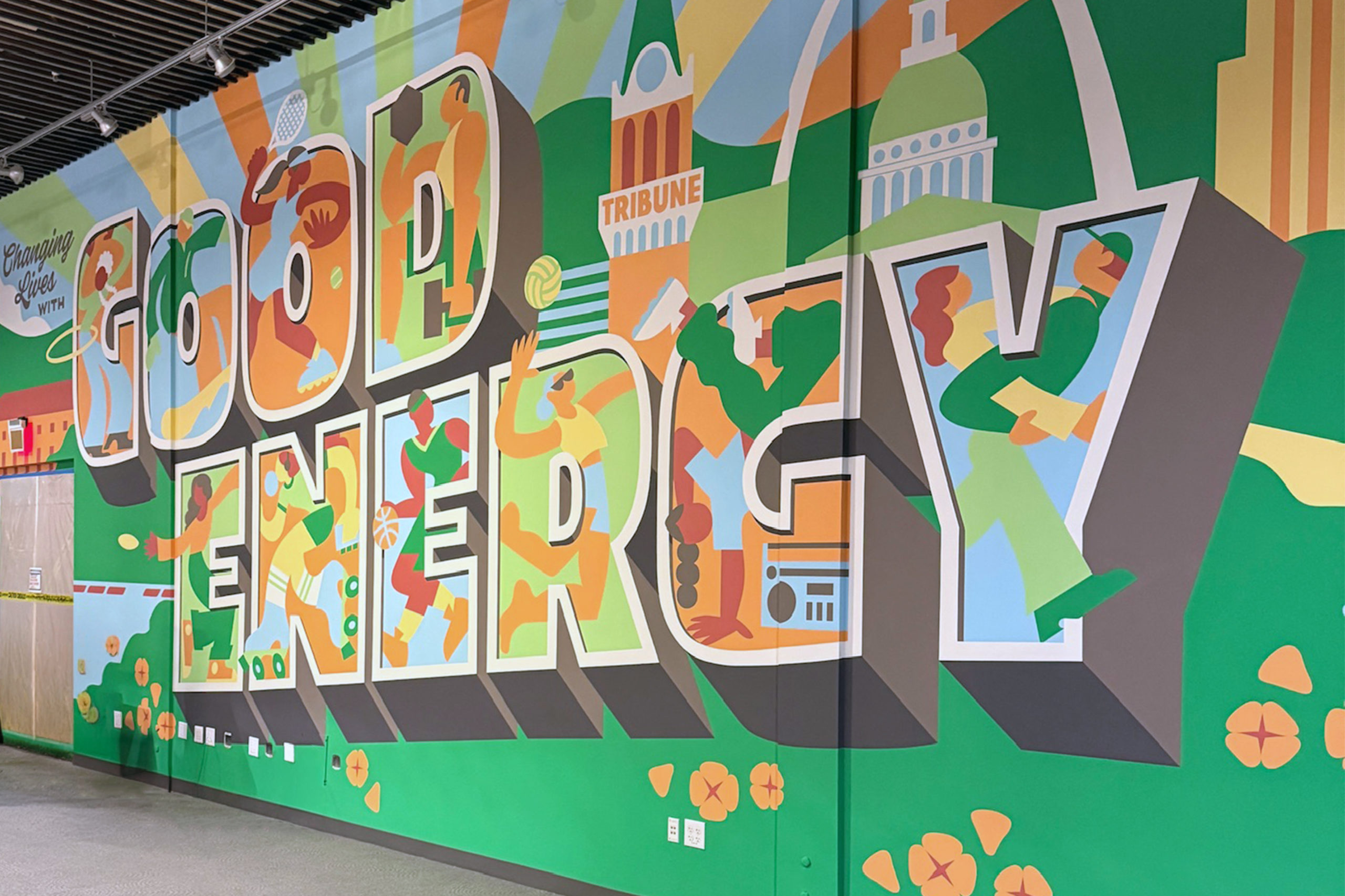 The central “GOOD ENERGY” installation anchors the space- combining dimensional letterforms with illustrated scenes of movement, sport, and everyday life. Rather than a static message, the mural reads as an active system- capturing the brand’s role in supporting real people, real routines, and real outcomes.