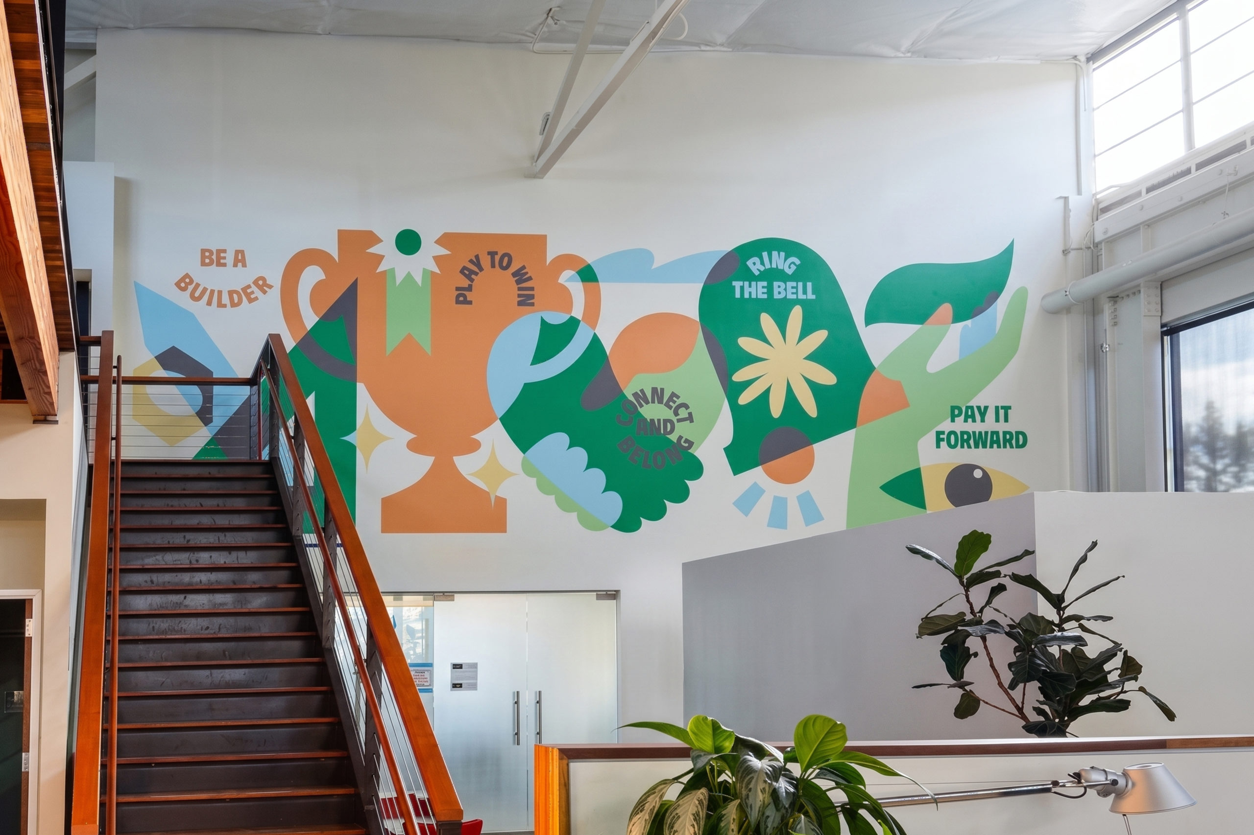 At Premier Nutrition’s Emeryville headquarters, the environment is designed to reflect the brand’s core ethos- fueling people to move, connect, and show up fully. In collaboration with Stout, large-scale hand-painted murals transform key interior spaces into moments of energy, identity, and shared experience.
